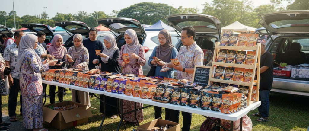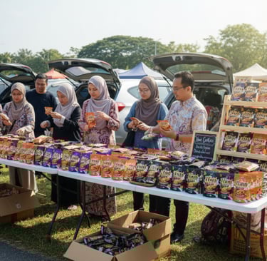 Suasana meriah sejak awal pagi — bonet kereta dibuka luas, meja dipenuhi aneka pilihan biskut, dan pelanggan tak putus-putus singgah mencuba serta membeli.